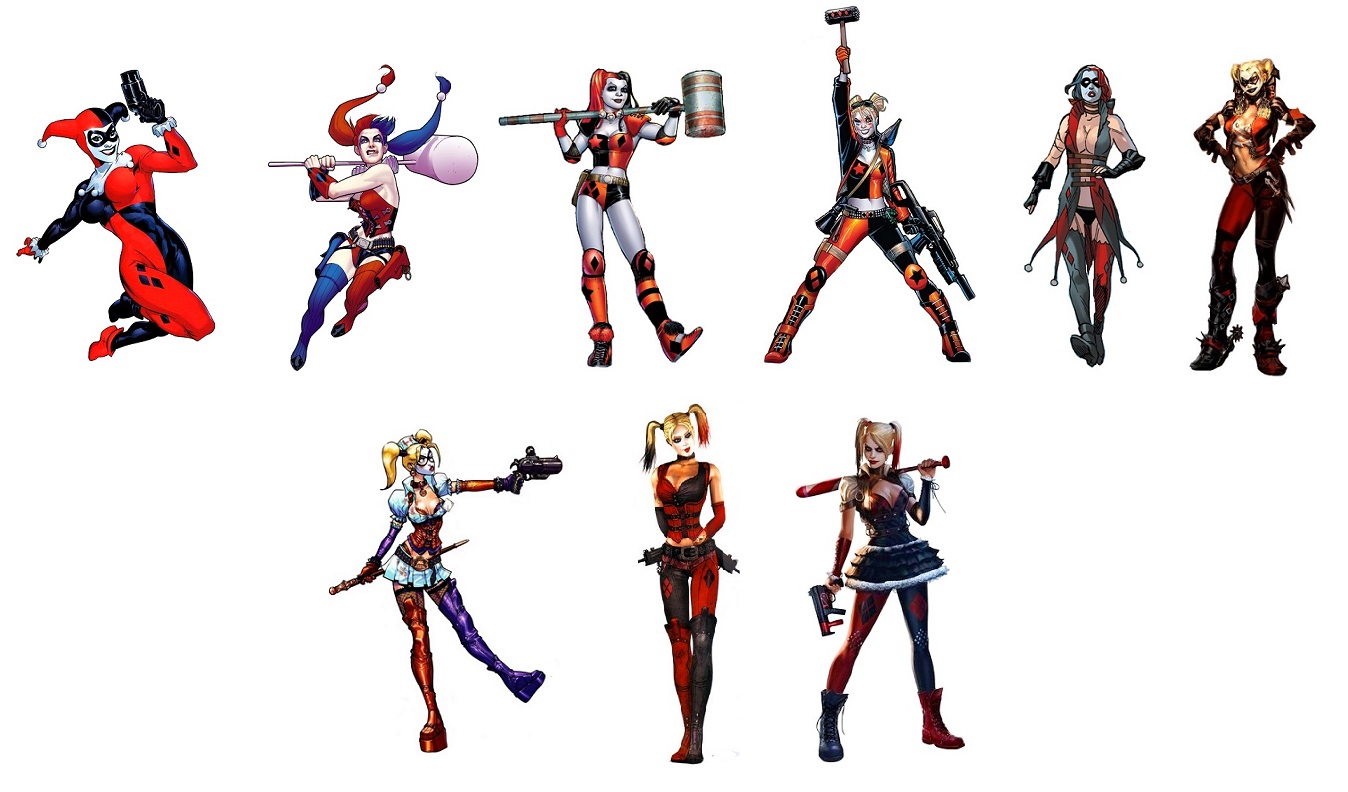 After Harley's Quinn big screen debut in Suicide Squad, some people were less than thrilled with Harley's "costume" of a red jacket and short-shorts. Let's look at the actual costumes Harley has worn in the comics and video-games. Harley Quinn began her career as a cartoon character in the Batman animated series in the 90's. A criminal psychiatrist turned villainous sidekick, Harleen Quinzel's love for the Joker led her to don the now iconic red-and-black jester costume of Harley Quinn. Her popularity resulted in Harley being added to the pages of DC comics. In the New 52 continuity, the Joker threw Dr. Harleen Quinzel into the same vat of acid that Batman threw him into. The chemicals bleached her skin and gave her two-toned red-and-blue hair. Donning a skimpy red-and-blue bodice with matching stockings, Harley Quinn was the Joker's girlfriend. However, his increasingly sadistic behavior drove Harley away from Gotham city. Harley strove to create her own identity and redesigned her look into a roller-derby uniform with elements of the original Harley Quinn jester costume. She also died the blue parts of her hair black. Later, Harley was made part of the Suicide Squad and sported a more militaristic version of her roller-derby costume. She also died her hair back to blonde. In the Injustice video game/tie-in comic continuity, Harley's look is a combination of her classic and new 52 costumes. Harley first sports red-and-black hair along with a jester themed red-and-black vest over two-toned stockings. Later she dies her hair back to blonde and dons a two-toned red-and-black jacket and with matching leather pants. In the Arkham Asylum/City/Knight games Harley first wears a modified nurse's uniform. Then she wears a red-and-black leather halter top with matching pants. Finally Harley wears a black Gothic Lolita-style dress over what appears to be the leggings of her classic jester costume.
